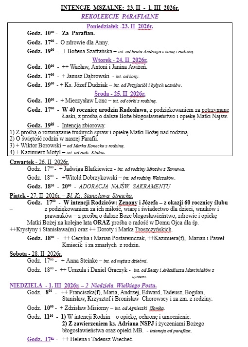 Intencje Mszy Św 23. II - 01. III 2026 r.
